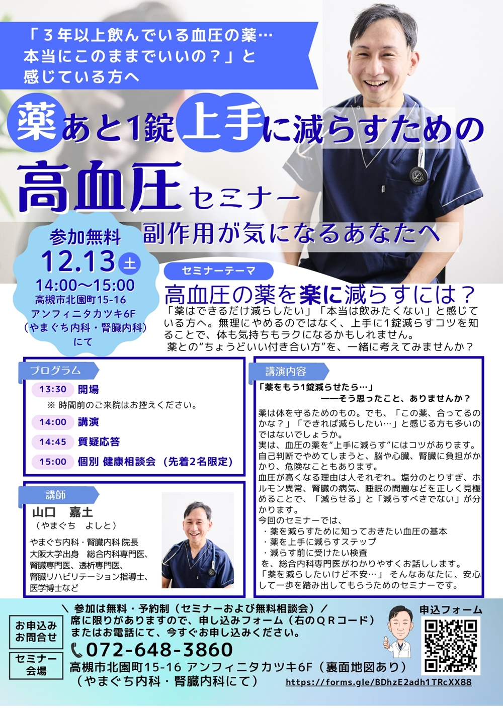 - 12/13(土)高血圧セミナー開催のお知らせ(参加無料、予約制)